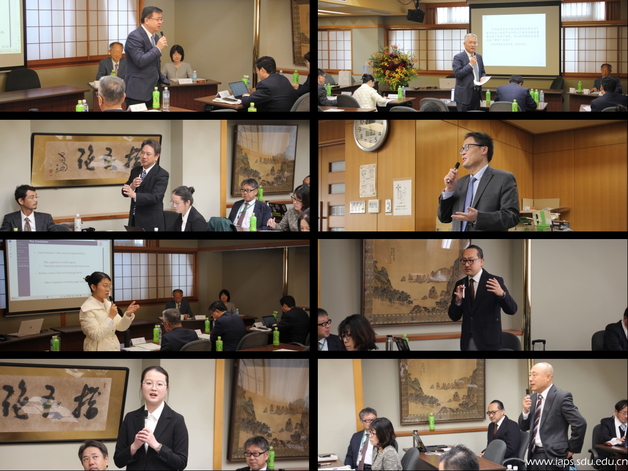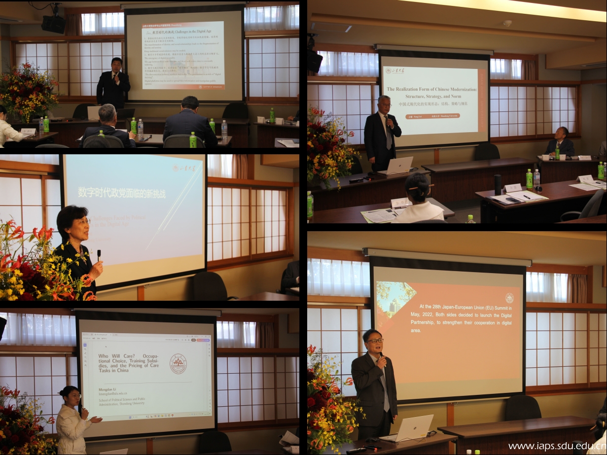 研讨会由山口大学东亚研究院教授寺地伸二主持。上半场由山东大学学术代表团教师作主题报告:朱贵昌教授围绕“日本与欧盟间的数字合作及其对中国的影响”作学术阐释,梳理日欧数字合作的关键议题,分析其对中国数字治理与产业发展的启示与外溢效应;方雷教授以“中国式现代化的实现形态:结构、战略与规范”为题,从制度结构、发展战略与价值规范三个维度论述中国式现代化的理论逻辑与实践路径;李济时教授聚焦“数字时代的社会变革及其挑战”,探讨技术变革对社会结构、公共治理和政策响应提出的新挑战;李宏教授以“数字时代政党的新挑战”为题,分析数字平台与舆论生态变迁对政党组织动员、议题设置与治理能力的影响;李梦丹老师围绕“谁来照护?中国的职业选择、培训补贴与护理定价”,以实证研究讨论照护人力供给、培训激励与价格形成机制。