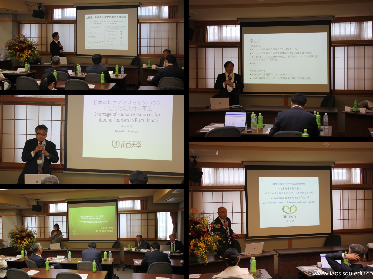 下半场由山口大学教师作专题报告。斋藤英智副教授与杨晴晴博士共同报告“日中地理标志(GI)保护制度的动向”,比较两国制度框架、执法机制与合作前景;朝水宗彦教授以“日本地方地区入境旅游人才短缺”为题,剖析人力供给不足的成因并提出培养与引进对策;角田由佳教授围绕“应对访视护理师短缺:迈向可持续的工作环境”,通过实地调查提出组织管理与制度支持的改进路径;滨岛清史教授以“日本就业惯行韧性的变化——以岗位型就业的理论与实践”为题,讨论企业人力资源治理的转型趋势;石龙潭教授作“数字政府建设路径——日本的尝试与启示”报告,系统总结日本推进数字政府的经验并提出对中日合作的建议。